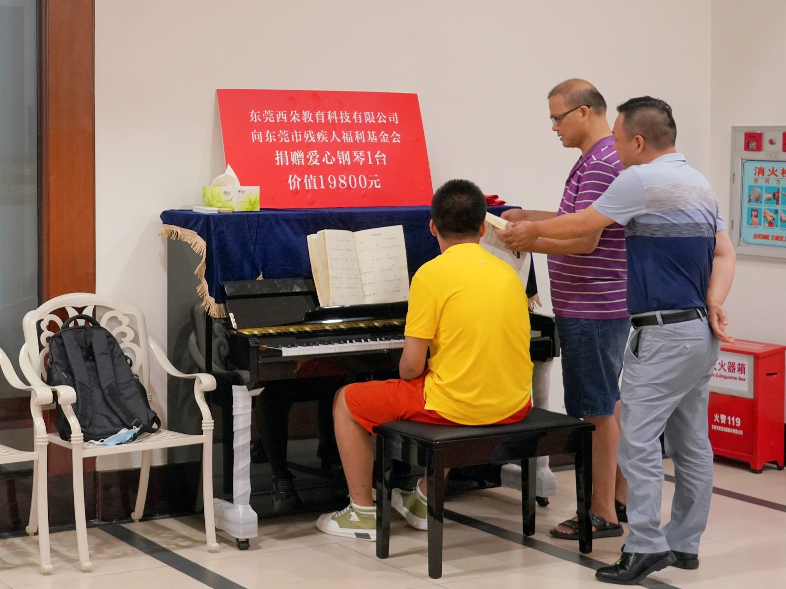韩军羽今年17岁,是一位孤独症少年,喜欢弹琴、唱歌、书法,每天都来艺术团练习,陈仙松理事现场聆听他的钢琴演奏,勉励军羽继续加油,练好钢琴,他还表示,特殊儿童的艺术培训是很好的载体,通过培训提升孩子们的能力,以后要带领爱心企业来观摩他们的表演,多为残疾人事业做贡献。
