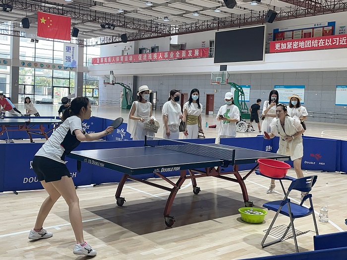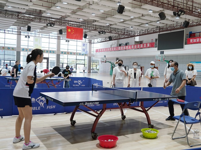训练场上,残疾人运动员们正在刻苦训练,大家被他们顽强拼搏的精神状态所感染,理事长叶宝维、专委会常务副会长李娅茜和残疾人乒乓球运动员进行了友好的互动,赢得热烈掌声。理事长叶宝维鼓励运动员们加紧训练,争取在即将举办的省残运会中取得优异的成绩。