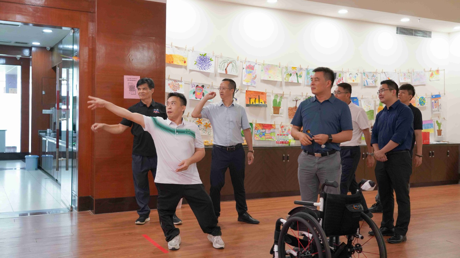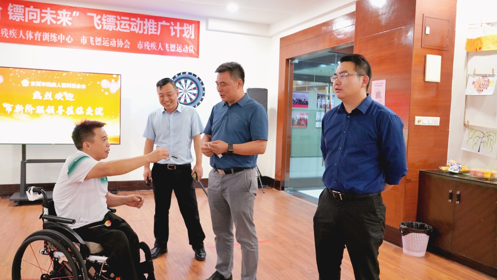 市新阶联会长冯敏治一行在我会副理事长邱霖霄、副会长谢忠艺的陪同下,首先来到基金会多能厅看望市残疾人飞镖运动队员,观摩飞镖训练,大家对这一项残健融合,共同竞技的运动表现出浓厚的兴趣。市飞镖运动协会会长、市残疾人飞镖运动队队长韩炳辉向大家介绍飞镖运动的特点和投掷技巧,热情地邀请领导们参与投掷,一起感受飞镖运动的乐趣,领导们和残疾人运动员们进行了亲切的交流和比赛互动,现场气氛十分热烈,掌声、欢呼声不断。冯会长一行还参观了爱心走廊、残艺团、盲人按摩、残健书画室等项目场地。