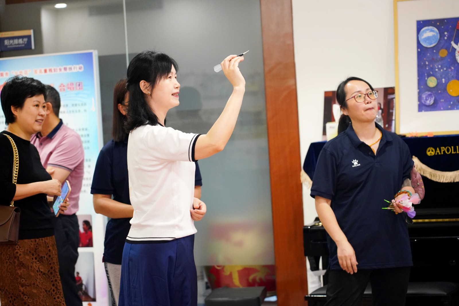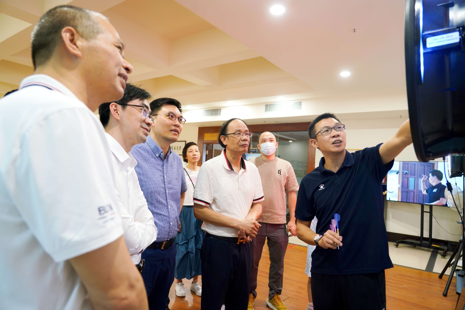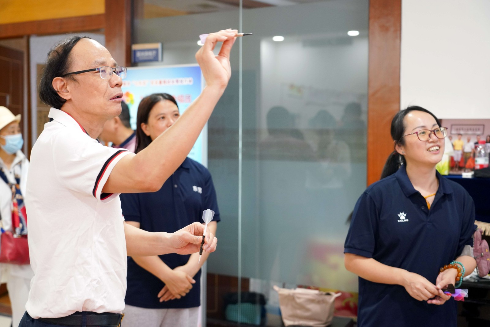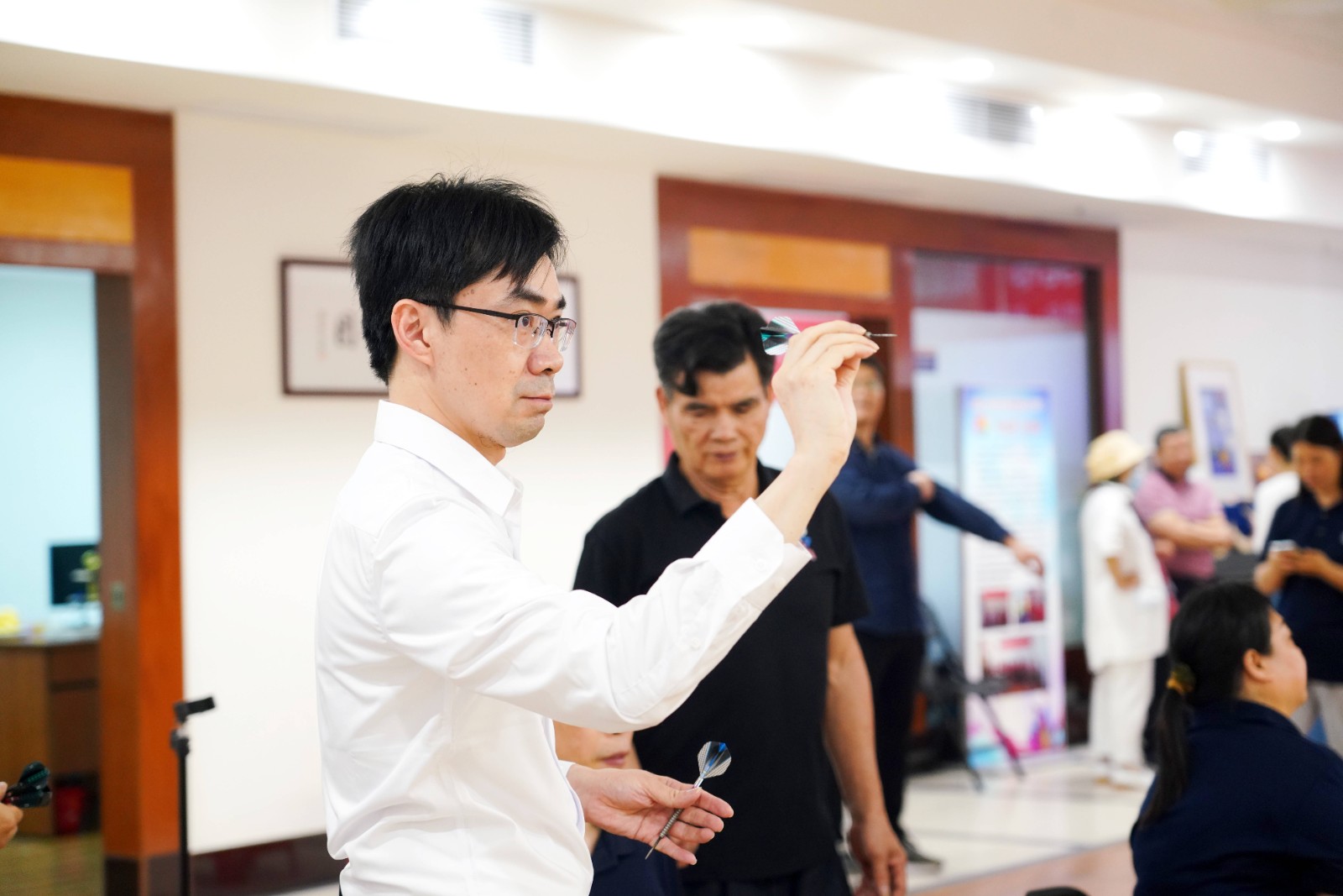 随后致公党领导们来到残艺团多功能厅,对残疾人飞镖运动员进行了亲切的问候与交流,残疾人飞镖运动员向大家讲解飞镖运动规则和投掷技法,并热情的邀请大家一起飞镖竞技,现场一声声的欢呼,激发了大家对飞镖运动的博弈精神、残疾人顽强拼搏的运动精神的感慨。