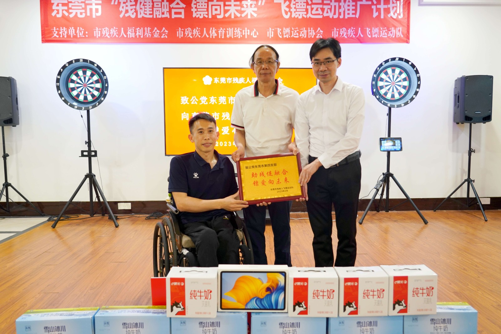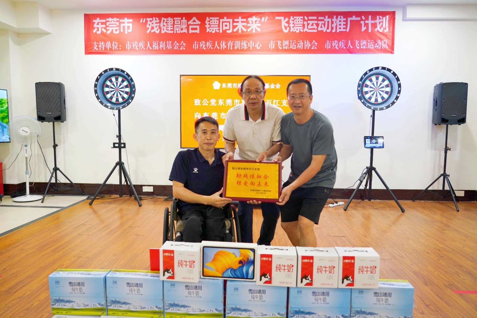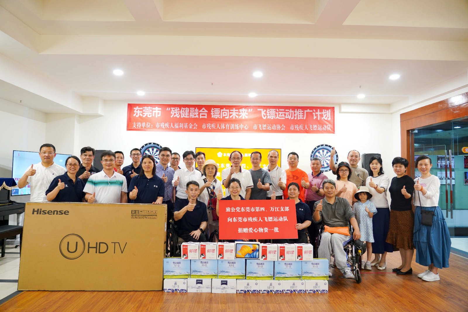 活动现场,致公党支部领导代表向残艺团、飞镖队捐赠了海信电视机和爱心物资一批。谢忠艺副会长接受捐赠并向致公党支部领导代表颁发爱心单位牌匾。