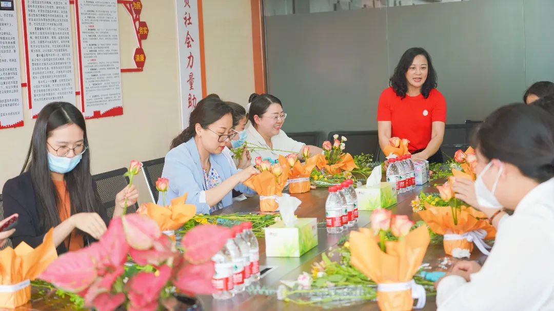 随后,邹组长一行来到会议室,参加了由残疾妇女刘桂清指导的花艺培训课。刘桂清是一名花艺创业者,她运用专业的花艺知识与精湛手法,向大家讲解了花艺作品的创作过程。爱心小组通过亲身体验,完成了各自的花艺作品,也感受到来自残疾妇女的创业热情。