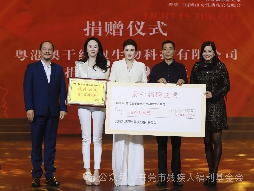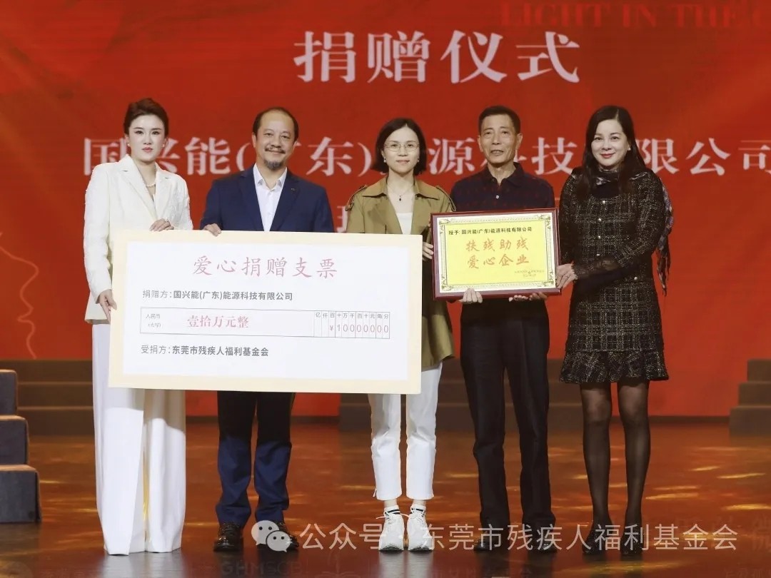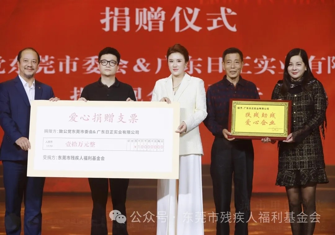 晚会现场,中国致公党东莞市委会&广东日正实业有限公司,粤港澳干细胞生物科技有限公司,国兴能(广东)能源科技有限公司分别向东莞市残疾人福利基金会捐赠 10 万元。市政协原副主席、基金会创会会长游敏达,市残联王锦绣副理事长、基金会叶宝维理事长、专委会蓝沛君会长接受捐赠并回赠爱心单位牌匾。