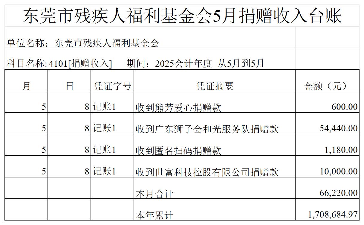 东莞市残疾人福利基金会2025年5月捐赠收入台账