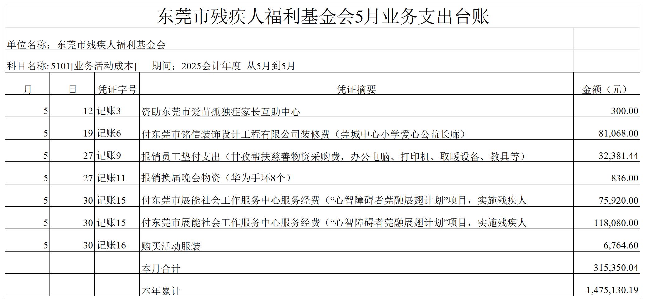 东莞市残疾人福利基金会2025年5月公益支出台账