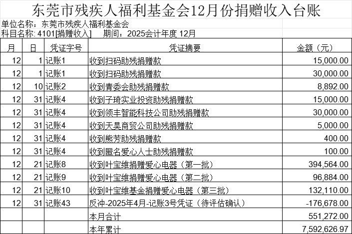 东莞市残疾人福利基金会2025年12月捐赠收入台账