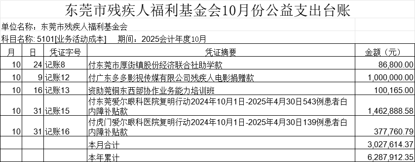 东莞市残疾人福利基金会2025年10月公益支出台账